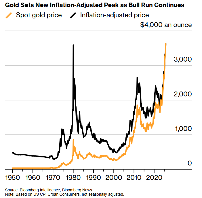 黃金價格已突破45年前經通脹調整後的歷史峯值。隨着對美國經濟軌跡的焦慮加劇,這場持續三年的黃金暴漲行情正深入未知領域。