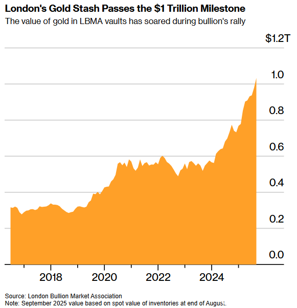 價格飆升使倫敦金庫儲存的黃金價值於上月首次突破1萬億美元,黃金亦超越歐元成為全球央行儲備中第二大資產。彭博智庫全球金屬與礦業主管格蘭特·斯波爾(Grant Sporre)重構了分析模型,更全面納入推動黃金暴漲的多元驅動因素。模型顯示除關鍵一點外,金價相對歷史標準已過高:相較於美股,黃金仍顯便宜。他稱若股市開始震盪,金價可能進一步攀升。